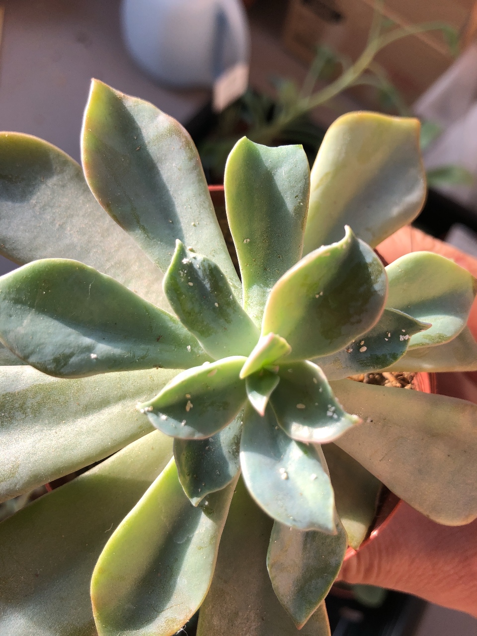 昨日の朝起きて多肉見てたら、コメリで50円で買ってきた初恋になにやら白いものが….。
